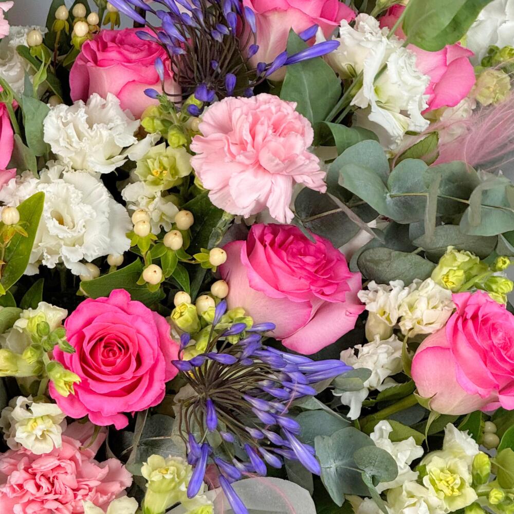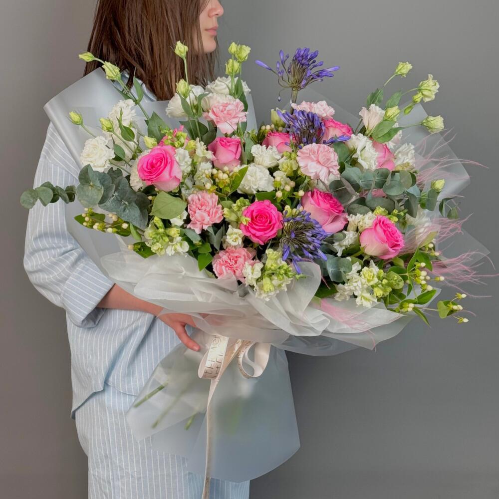 Этот букет будто собрал эмоции разных оттенков — малиновый драйв, розовая забота и голубой штрих вдохновения. Динамичный и живой, как момент счастья. Отличный выбор для яркой личности.