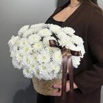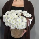 Белоснежные кустовые хризантемы в уютной плетёной корзине. Идеальный вариант для подарка без повода — нежный, лёгкий, утончённый.