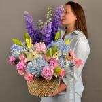 Дельфиниум - 4 шт. Лилия - 3 шт. Пион - 5 шт. Роза - 4 шт. Гвоздика - 15 шт. Гербера - 8 шт.
