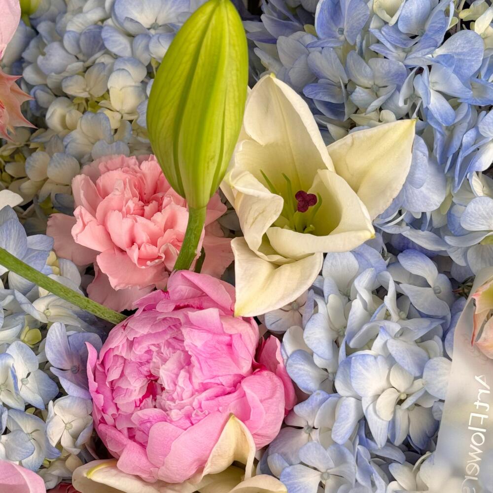Дельфиниум - 4 шт. Лилия - 3 шт. Пион - 5 шт. Роза - 4 шт. Гвоздика - 15 шт. Гербера - 8 шт.
