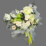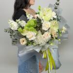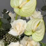 Антуриум - 2 шт. Бруния - 2 шт. Вибурнум - 5 шт. Гортензия - 1 шт. Маттиола - 5 шт. Эвкалипт - 2 шт. Роза - 7 шт. Упаковка - 1 шт. Ранункулюс - 3 шт.
