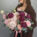 Гортензия - 3 шт. Лизиантус - 2 шт. Эвкалипт - 1 шт. Роза - 5 шт. Хризантема - 5 шт.