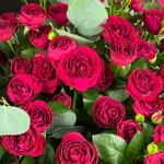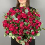 Изящная композиция в корзине, где бордовая спрей-роза обрамлена ароматным эвкалиптом. Это не просто цветы — это готовая атмосфера для дома или офиса: стильная, уютная и благородная.