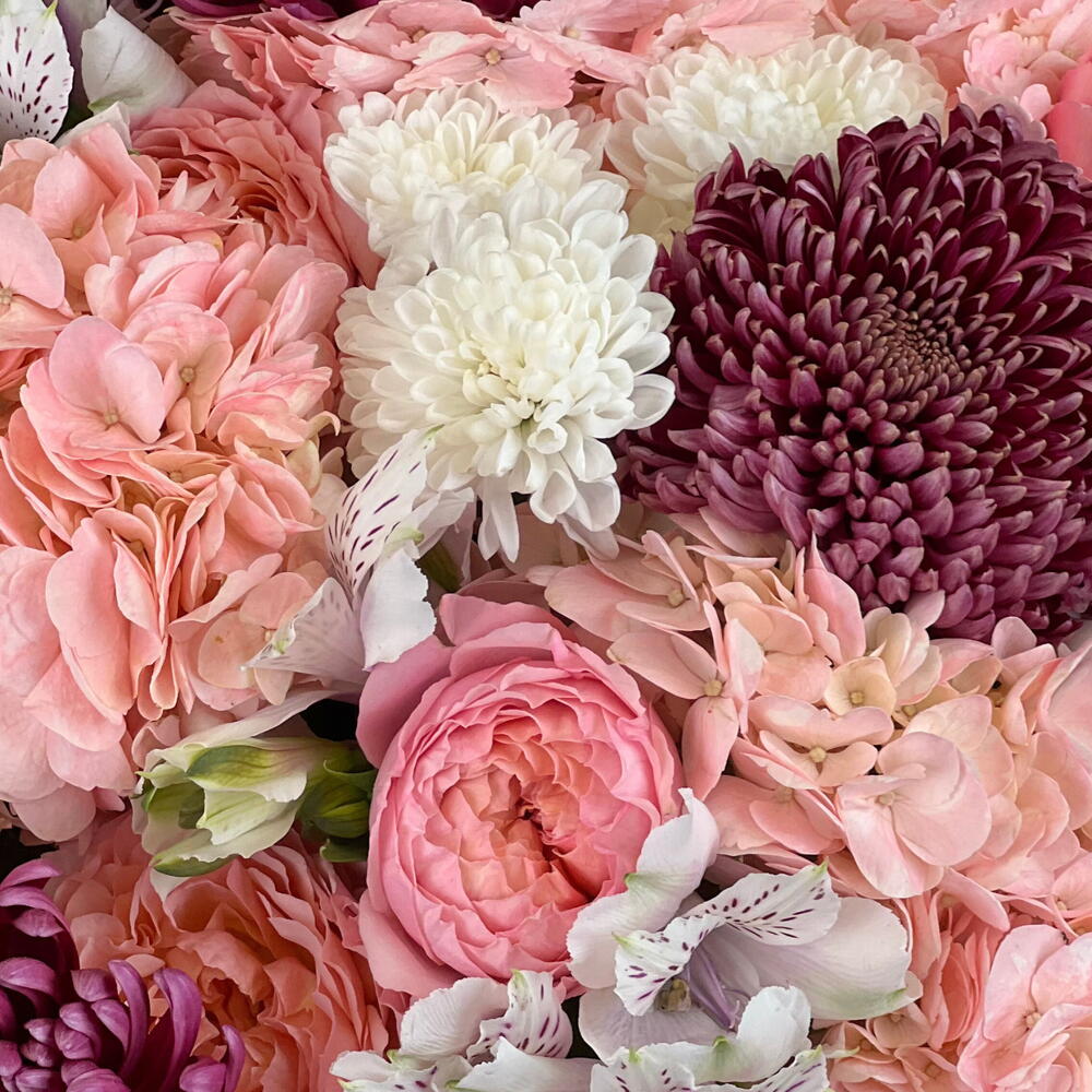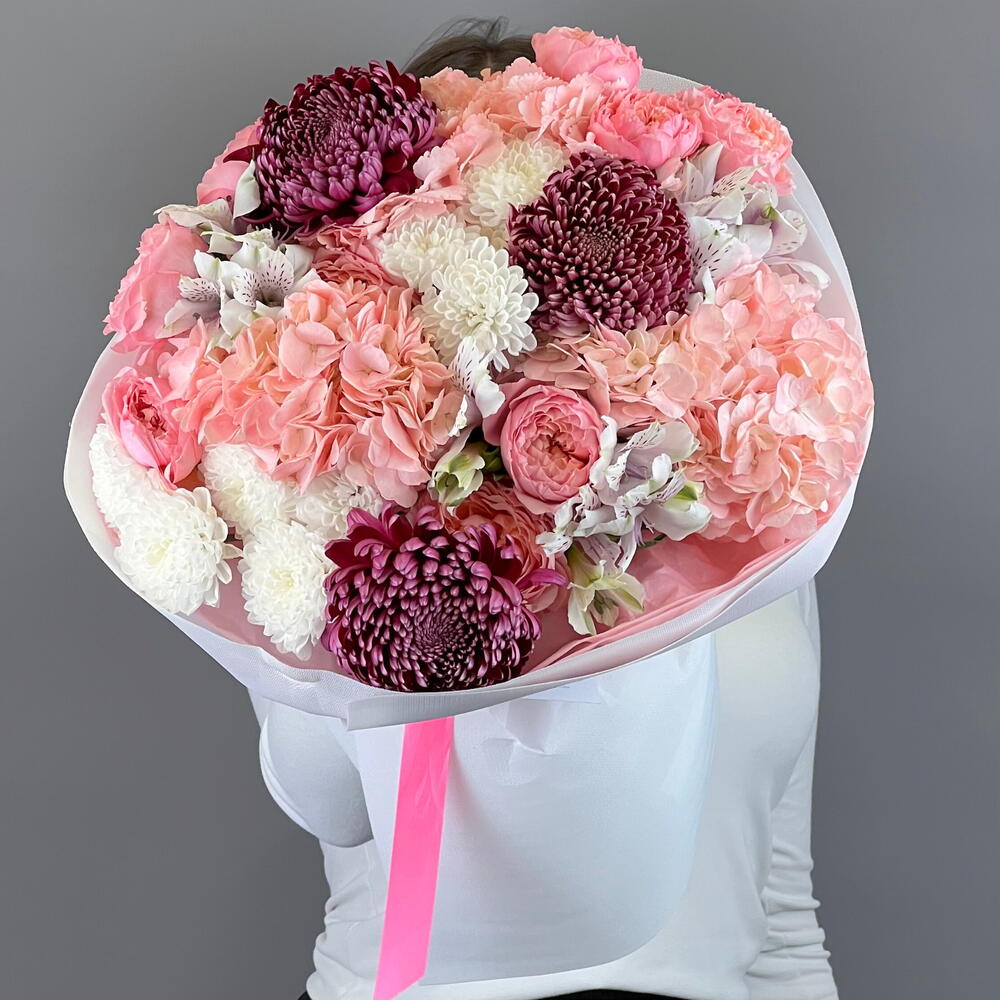 Альстромерия - 3 шт. Гортензия - 3 шт. Хризантема - 5 шт. спрей розы - 3 шт.