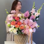 Антуриум - 4 шт. Вибурнум - 6 шт. Гортензия - 5 шт. Лизиантус - 4 шт. Рускус - 3 шт. Роза - 10 шт. Хризантема - 3 шт. Гладиолус - 2 шт. георгины - 5 шт.