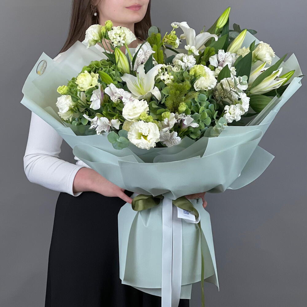 Лёгкий, как глоток свежего воздуха. Белоснежные лепестки, зелёные акценты и воздушная упаковка делают букет воплощением чистоты и новых начал. Он универсален — подойдёт и на день рождения, и для любимой, и как знак благодарности.