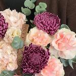 Гортензия - 2 шт. Лизиантус - 1 шт. Эвкалипт - 1 шт. Роза - 3 шт. Хризантема - 3 шт.