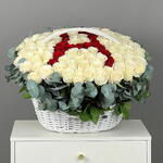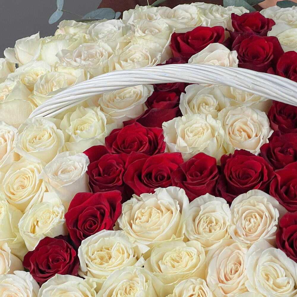 Сочетание белых и красных роз делает композицию выразительной, но при этом гармоничной. Белый цвет символизирует искренность, красный — глубину эмоций.