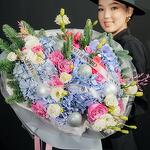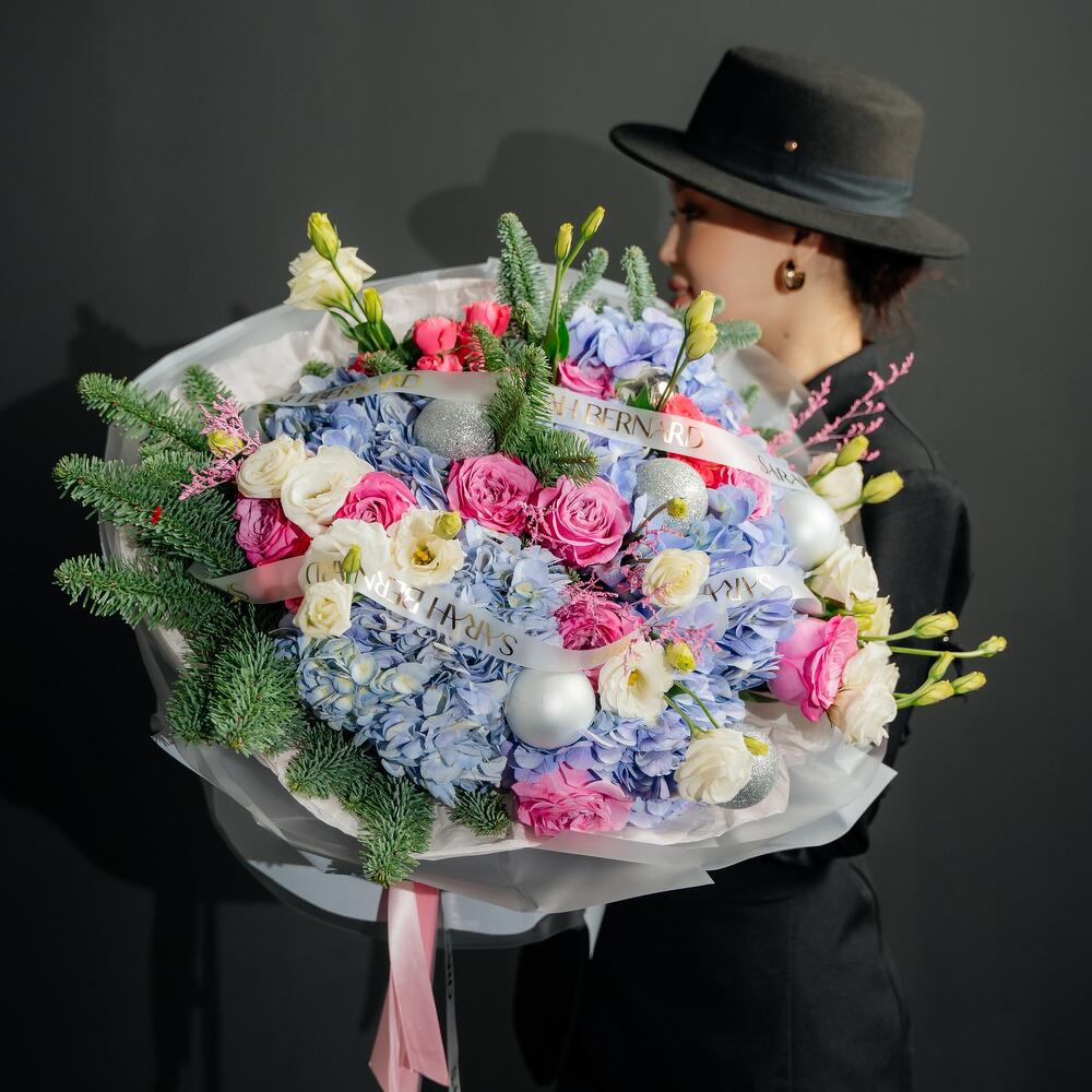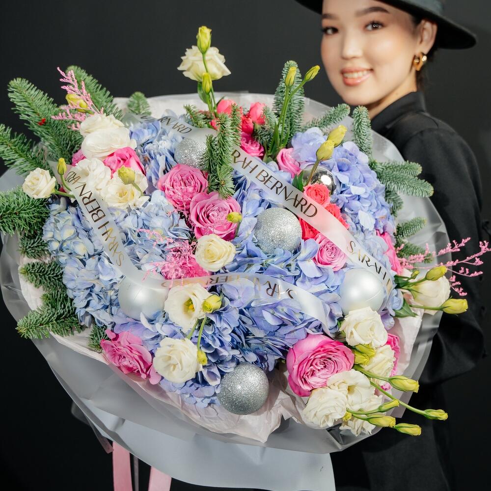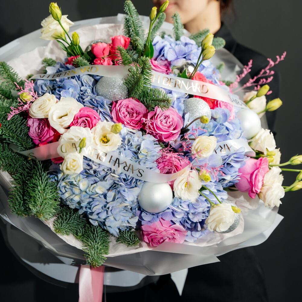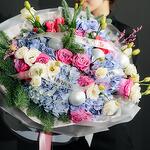 Гортензия - 7 шт. Кустовая роза - 3 шт. Эустома - 11 шт. Голландская роза - 15 шт. Нобилис - 2 шт. Шары новогодние - 9 шт.