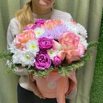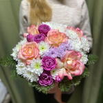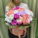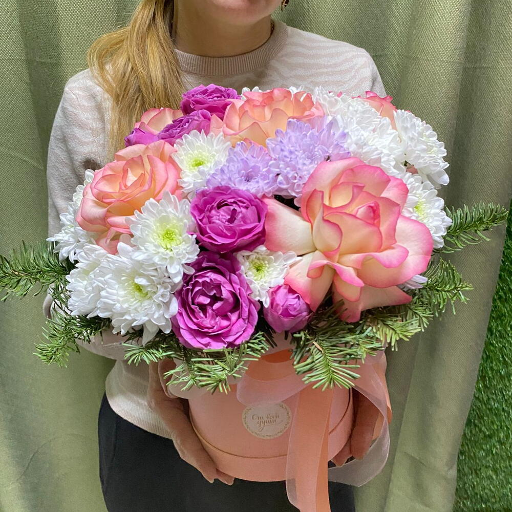 Кустовая роза - 2 шт. Упаковка - 1 шт. Коробка шляпная - 1 шт. Французская роза - 5 шт. Нобилис - 1 шт. Оазис флористический - 1 шт. хризантемы кустовые - 3 шт.