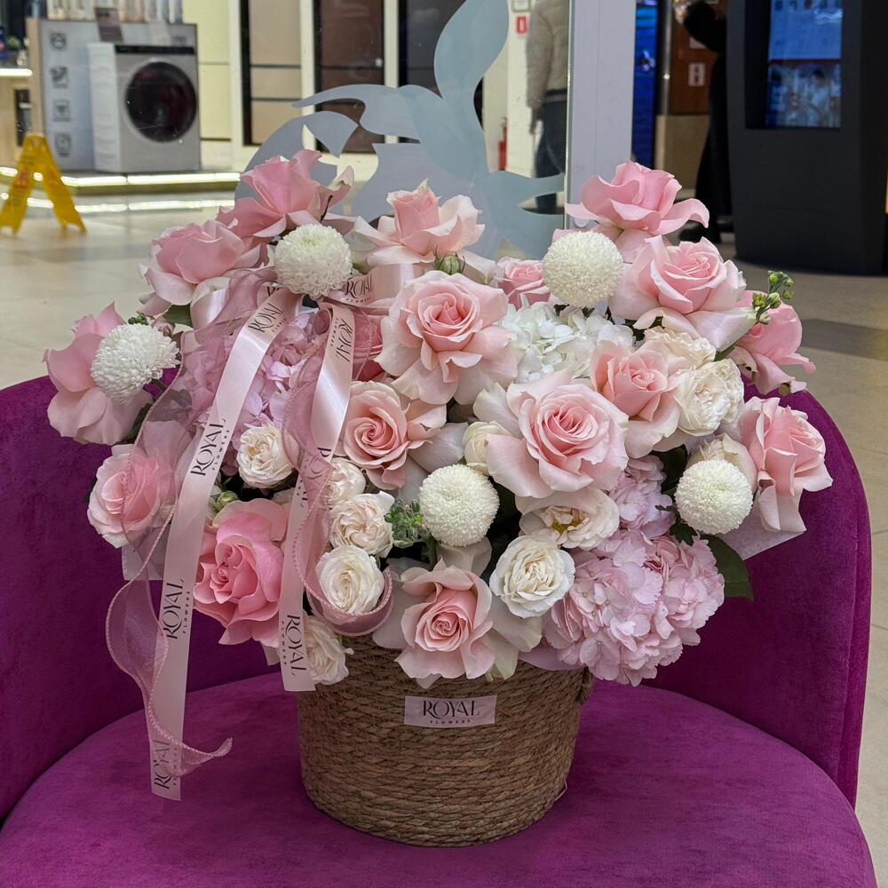 Гортензия - 3 шт. Маттиола - 3 шт. Кустовая роза - 4 шт. Роза одноголовая - 17 шт. Хризантема одноголовая - 5 шт.