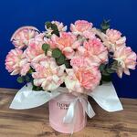 Эвкалипт - 6 шт. Диантус - 4 шт. Коробка шляпная - 1 шт. Французская роза - 11 шт. Оазис флористический - 1 шт.