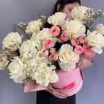 Ваксфлауэр - 2 шт. Гортензия - 1 шт. Коробка шляпная - 1 шт. Спрей роза - 4 шт. розы - 11 шт.