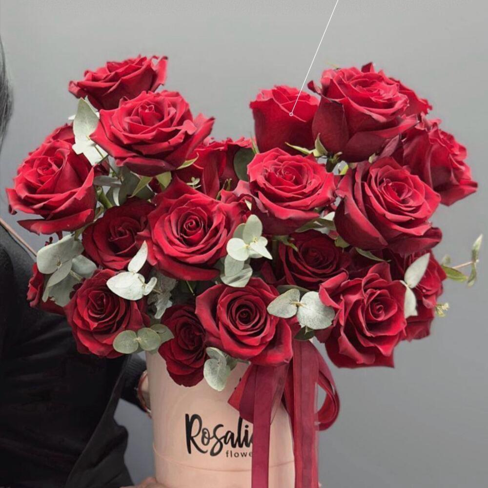 Эвкалипт - 2 шт. Роза Эквадор - 21 шт. Коробка шляпная - 1 шт. Оазис флористический - 1 шт.