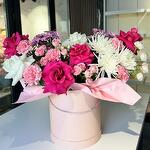 Хризантема кустовая - 2 шт. Гвоздика - 5 шт. Коробка шляпная большая - 1 шт. Хризантема одноголовая белая - 3 шт. Спрей роза - 3 шт. розы - 6 шт.