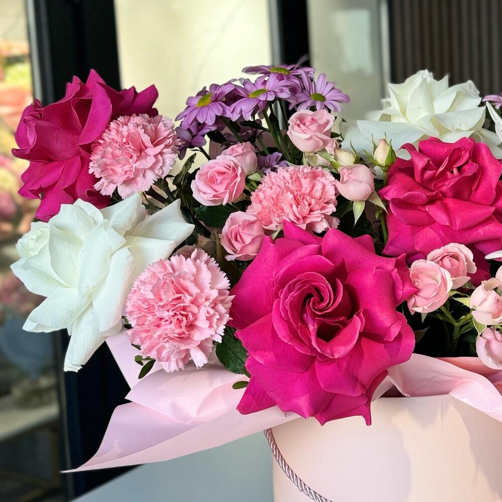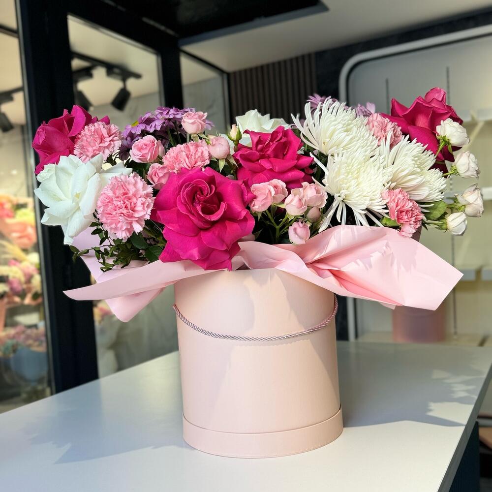 Хризантема кустовая - 2 шт. Гвоздика - 5 шт. Коробка шляпная большая - 1 шт. Хризантема одноголовая белая - 3 шт. Спрей роза - 3 шт. розы - 6 шт.