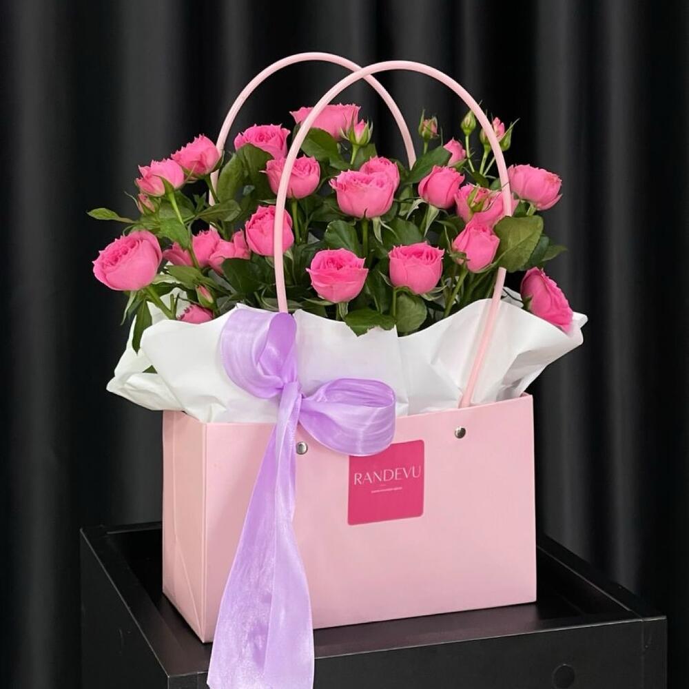 Роза кустовая - 7 шт. Оазис флористический - 1 шт. Сумочка картонная - 1 шт. Калька упаковка - 1 шт.
