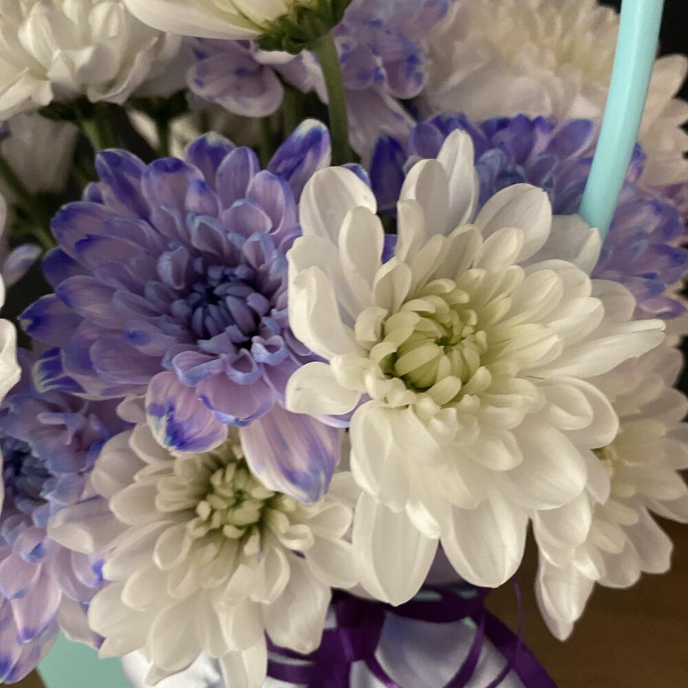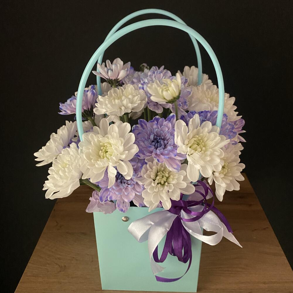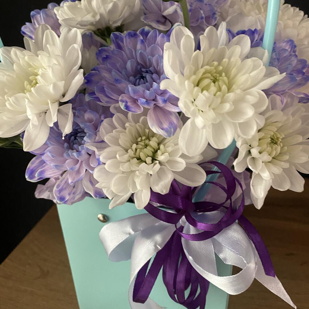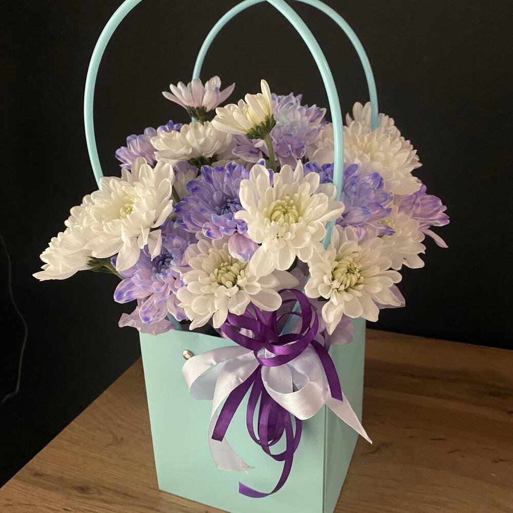 Хризантема кустовая - 3 шт. Лента атласная - 1 шт. Крафт пакет - 1 шт. открытка с вашими пожеланиями - 1 шт.