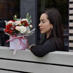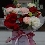 Кустовая роза - 2 шт. Гвоздика - 3 шт. Эустома - 2 шт. Коробка - 1 шт. Пленка матовая - 1 шт. Голландская роза - 3 шт. Эвкалипт Цинерея - 1 шт. лента атлант - 2 шт.