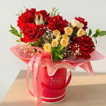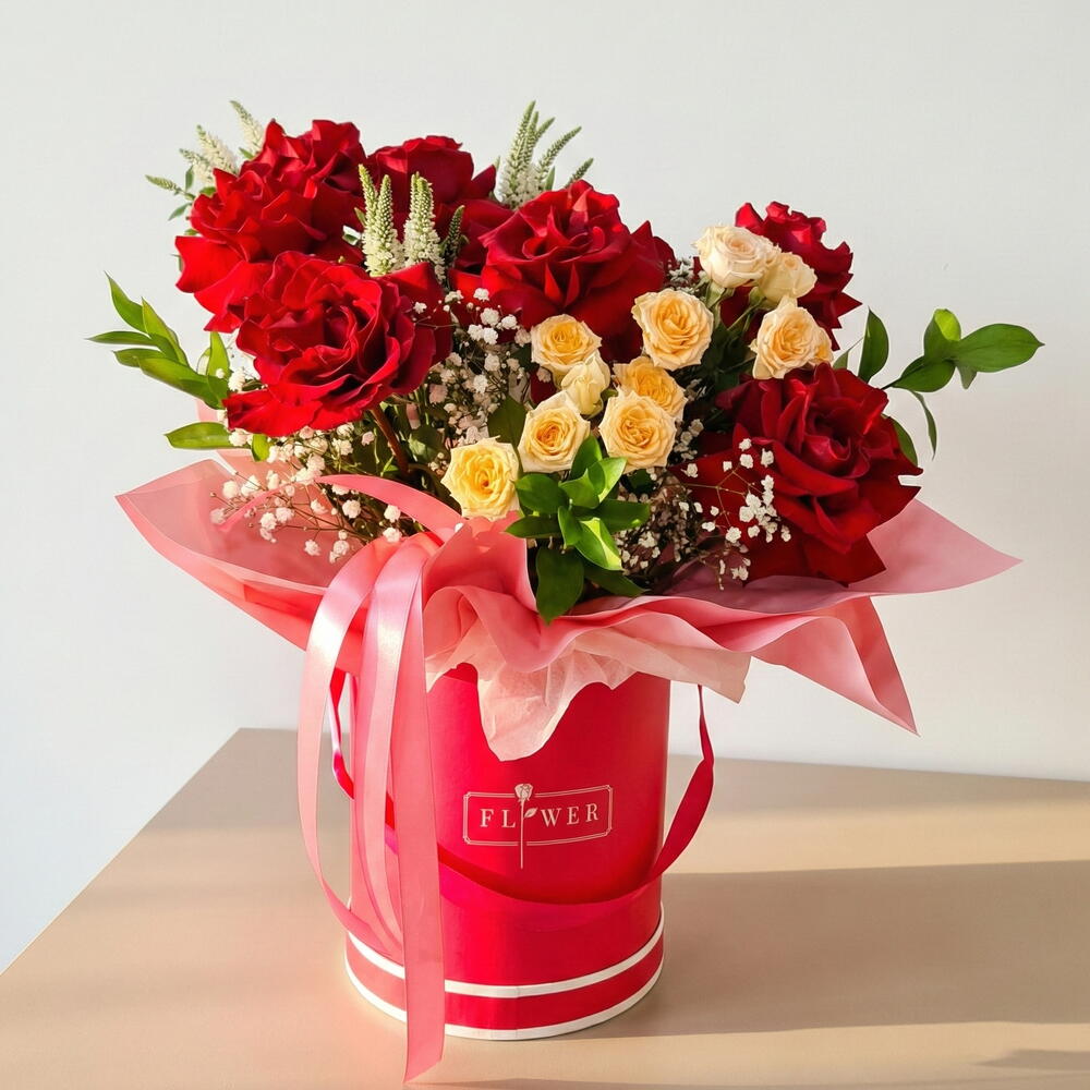 Роза кустовая - 2 шт. Рускус - 5 шт. Коробка шляпная - 1 шт. Упаковка дизайнерская - 1 шт. Оазис флористический - 2 шт. Гипсофила Белая - 1 шт. роза эксплорер эквадор - 11 шт. вероника белая кустовая - 3 шт.