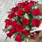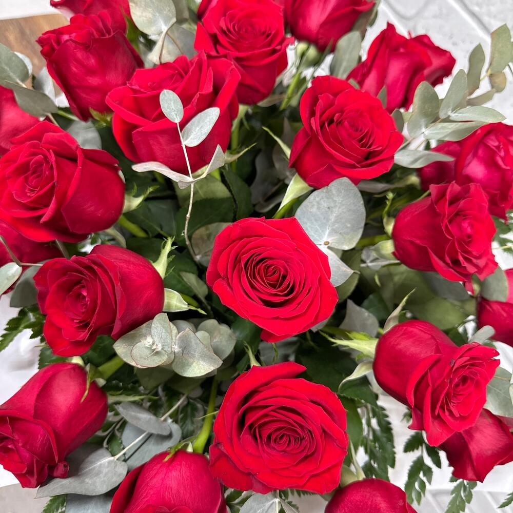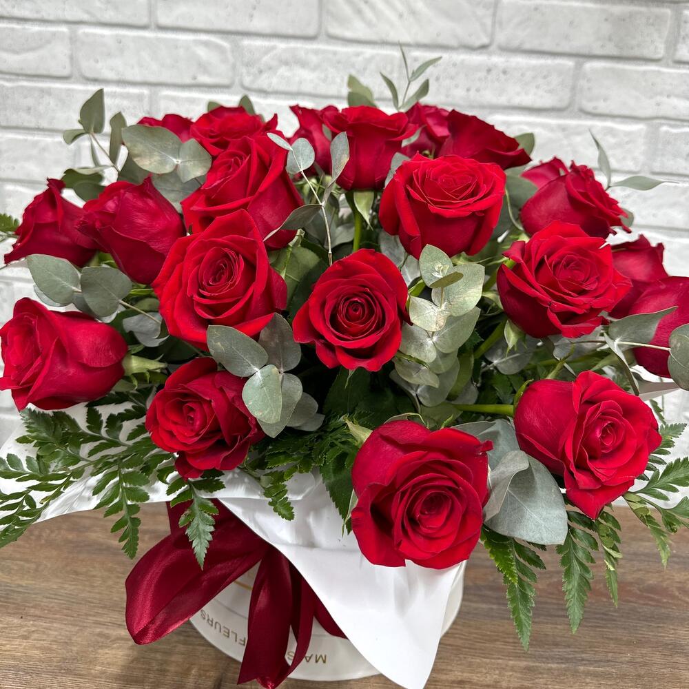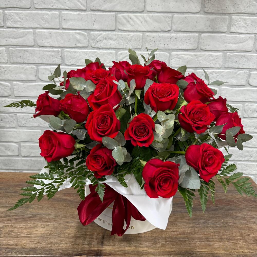Лента - 1 шт. Эвкалипт - 5 шт. Роза - 25 шт. Коробка - 1 шт. Ледерварен - 5 шт.