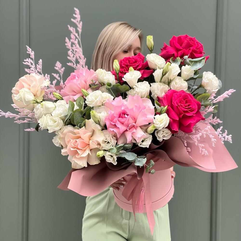 Лизиантус - 7 шт. Эвкалипт - 3 шт. Сухоцветы - 3 шт. розы - 7 шт.