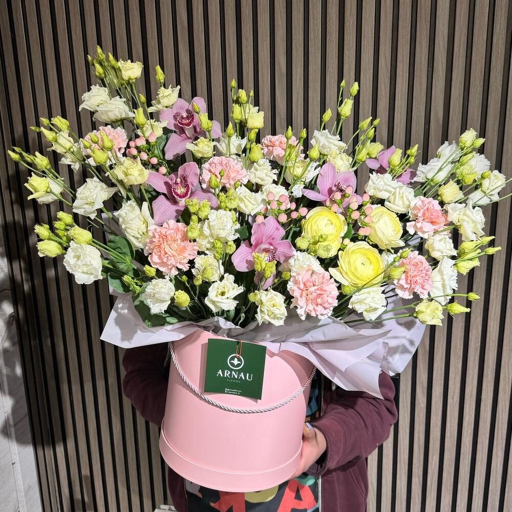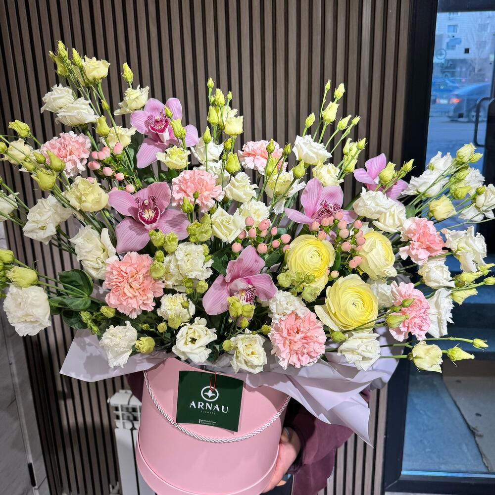 Лизиантус - 11 шт. Орхидея Цимбидиум - 5 шт. Диантус - 7 шт. Ранункулюс - 3 шт. коробка большая шляпная - 1 шт.
