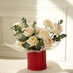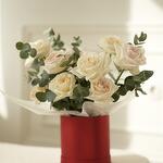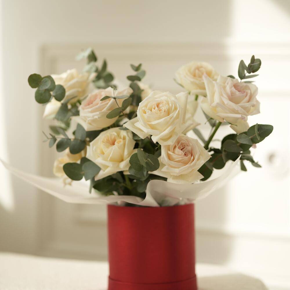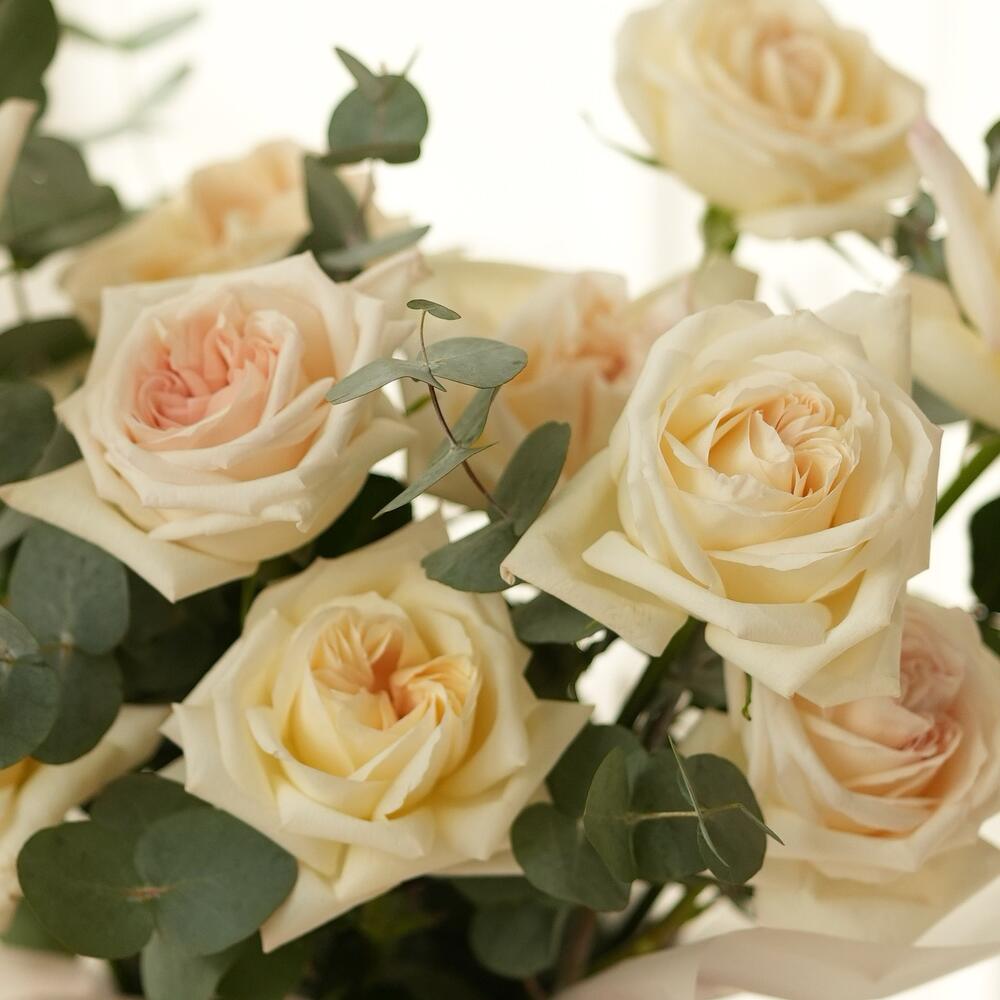 Эвкалипт - 10 шт. Коробка - 1 шт. роза candlelight - 11 шт. витамины для цветов (кризал) - 1 шт. открытка бесплатно(на выбор) - 1 шт.