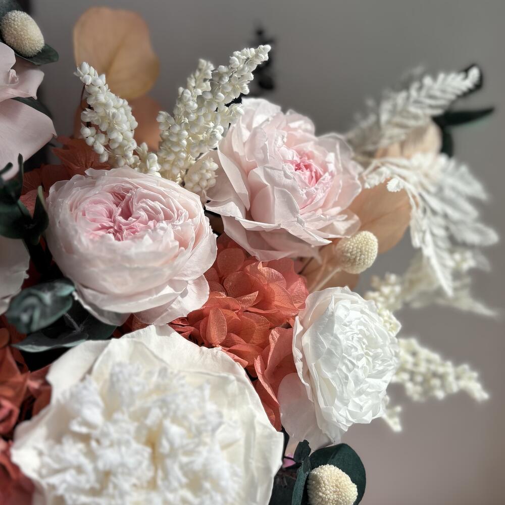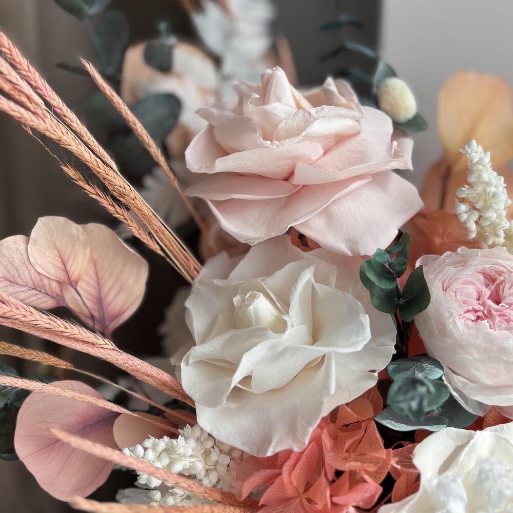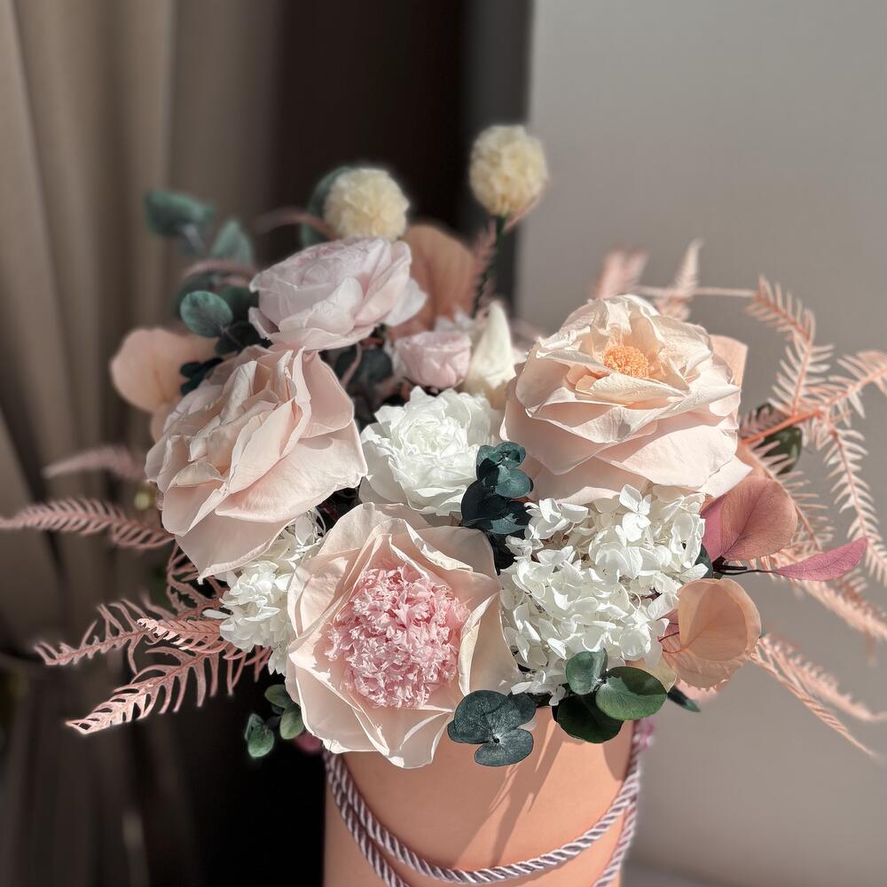 Роза стабилизированная - 3 шт. Эвкалипт стабилизированный - 150 гр. гортензия стабилизированная - 3 шт. роза пионовидная стабилизированная - 4 шт.