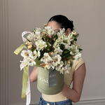 Альстромерия - 7 шт. Эвкалипт - 1 шт. Лента атласная - 1 шт. Оазис - 1 шт. Коробка - 1 шт.