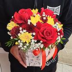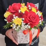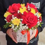 Яркая шестигранная коробочка из роз и хризантем, с гипсофилой и зеленью.