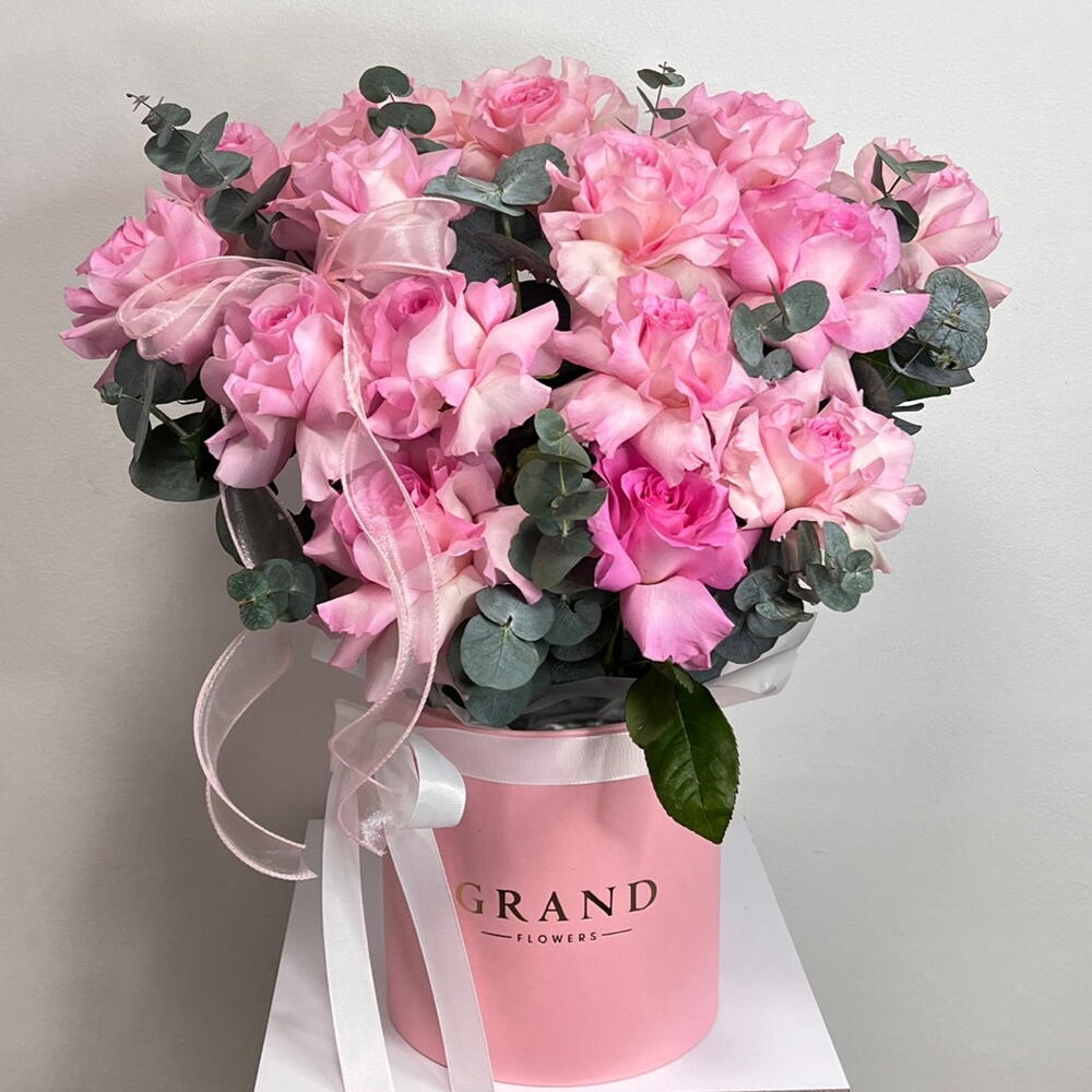 Коробка шляпная - 1 шт. Эвкалипт Микс - 5 шт. Оазис флористический - 2 шт. мандала вывернутая роза - 15 шт.
