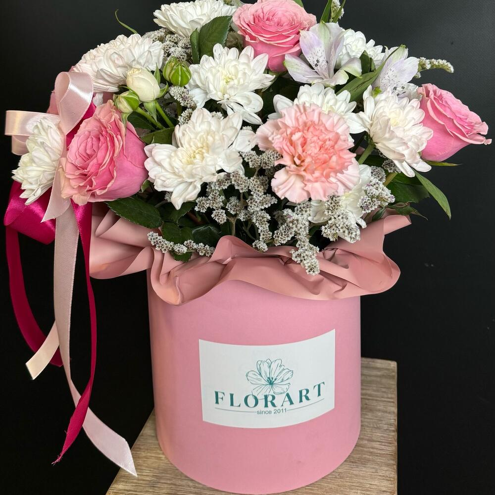 Альстромерия - 1 шт. Хризантема кустовая - 3 шт. Роза - 5 шт. Кустовая роза - 1 шт. Зелень - 3 шт. Гвоздика - 2 шт.