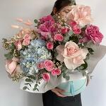 Ваксфлауэр - 2 шт. Гортензия - 1 шт. Эвкалипт - 3 шт. Сухоцветы - 1 шт. Спрей роза - 5 шт. розы - 7 шт.