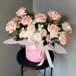Альстромерия - 3 шт. Хризантема кустовая - 2 шт. Кустовая роза - 3 шт. Роза французская - 11 шт. Эвкалипт Микс - 2 шт. гвоздики - 7 шт.