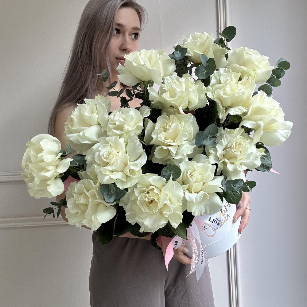 Эвкалипт - 1 шт. Коробка - 1 шт. Французская роза - 15 шт.