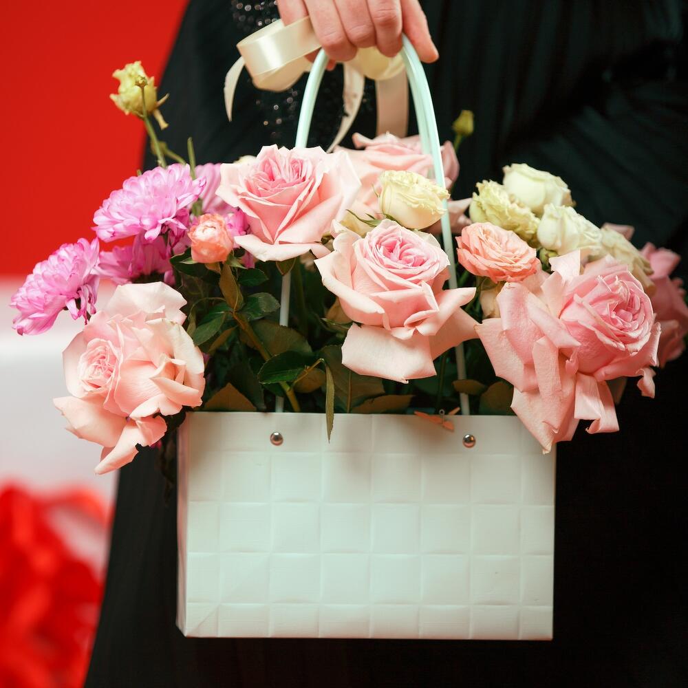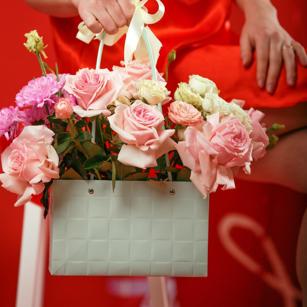 Хризантема кустовая - 1 шт. Кустовая роза - 3 шт. Роза Эквадор - 7 шт. Сумочка - 1 шт. Оазис флористический - 1 шт.