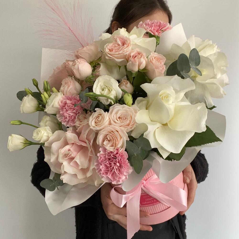 Лизиантус - 3 шт. Эвкалипт - 2 шт. Гвоздика - 3 шт. Сухоцвет - 1 шт. Спрей роза - 3 шт. розы - 5 шт.