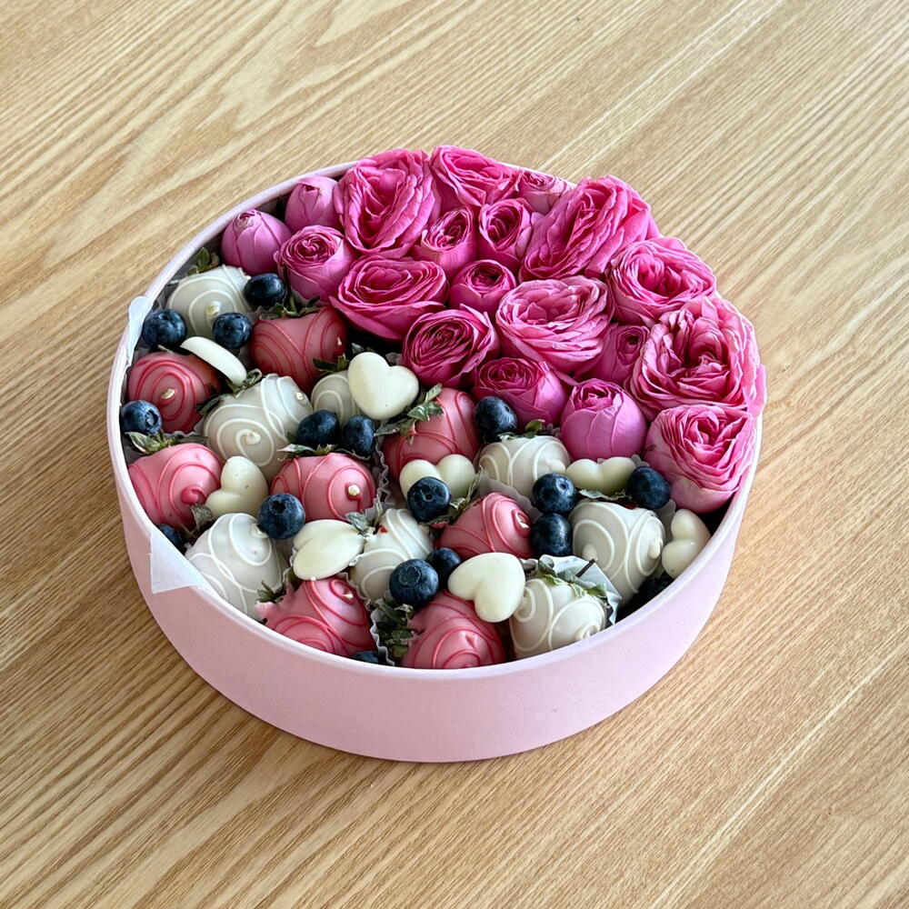 Нежная клубника в розовом и белом бельгийском шоколаде, декорированная сердечками и ягодами, сочетается с бархатными пионовидными розами. Такой бокс расскажет о чувствах лучше любых слов.