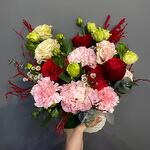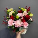 Ваксфлауэр - 1 шт. Лизиантус - 4 шт. Гвоздика - 2 шт. Эвкалипт Baby Blue - 1 шт. Red Piano кустовая роза - 3 шт. ветки декоративные - 2 шт.
