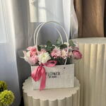 Безумно удобная композиция в сумочке, которая не требует вазы, все что нужно делать: просто поливать флористическую губку внутри нее 🤗