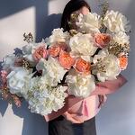 Гортензия - 1 шт. Коробка шляпная - 1 шт. Ваксфлауэр белый - 3 шт. джульетта кустовая роза пионовидная - 3 шт. розы вывернутые - 11 шт.
