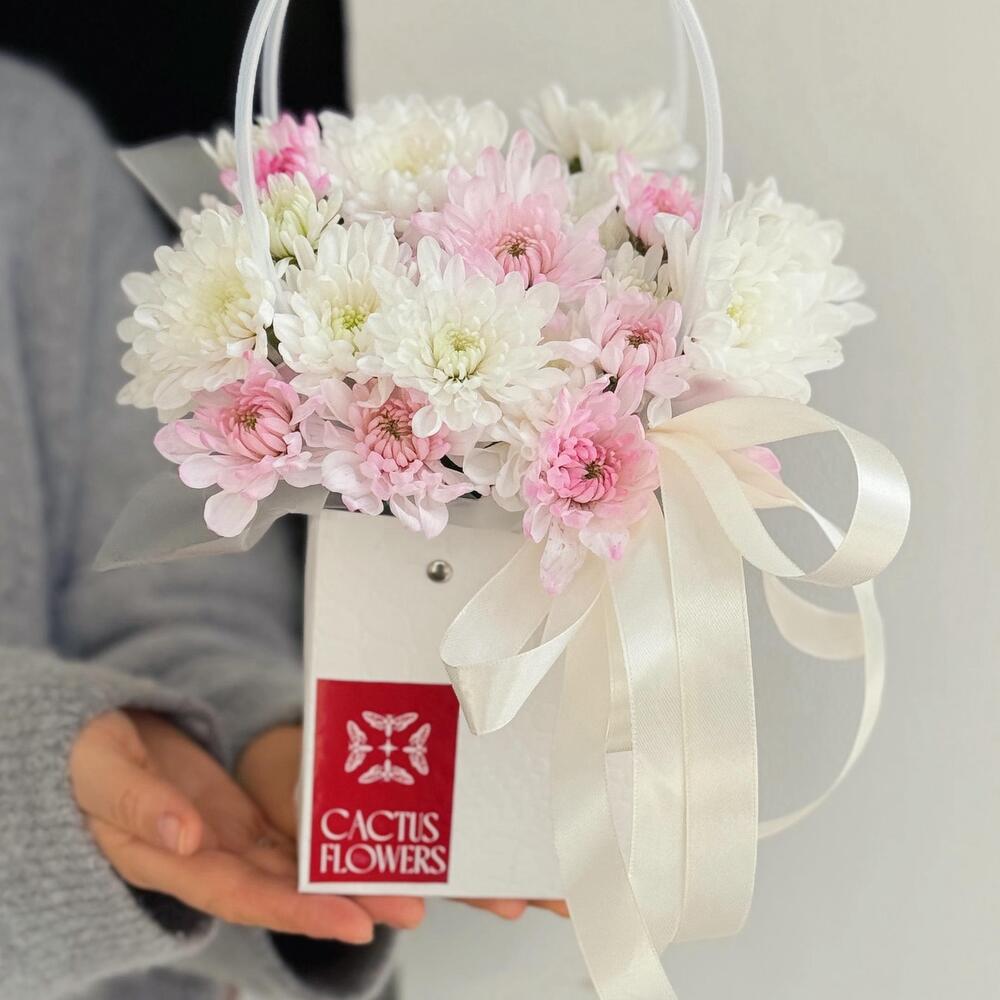 Хризантема кустовая - 2 шт. Упаковка дизайнерская - 1 шт. Сумочка - 1 шт.