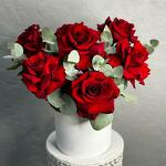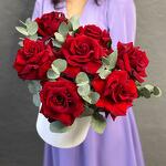 Эвкалипт - 3 шт. Роза Эквадор - 7 шт. Коробка шляпная - 1 шт. Оазис флористический - 1 шт.