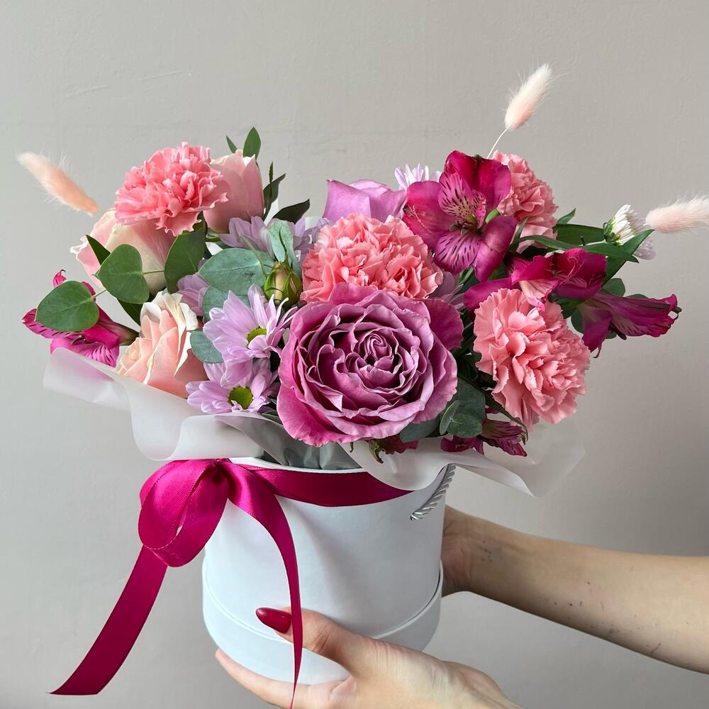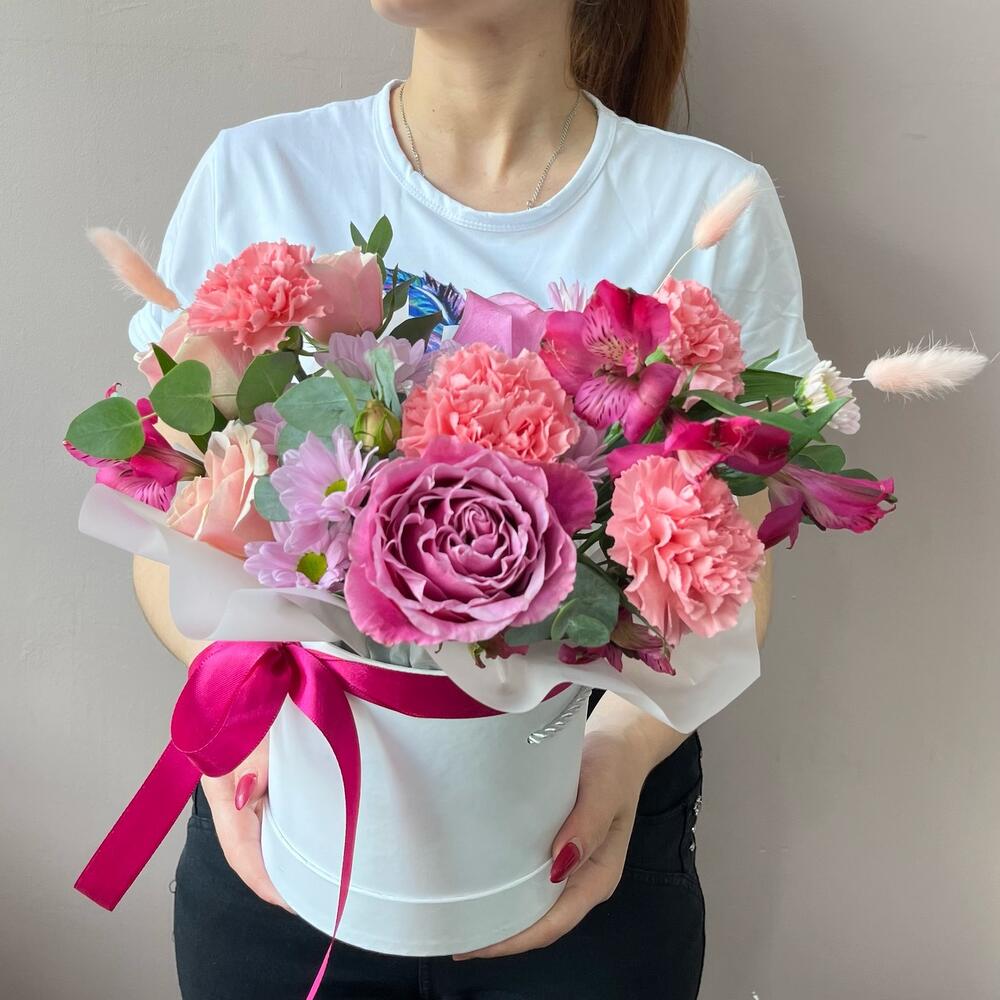 Хризантема кустовая - 1 шт. Кустовая роза - 1 шт. Диантус - 3 шт. Лагурус - 3 шт. розы - 2 шт.