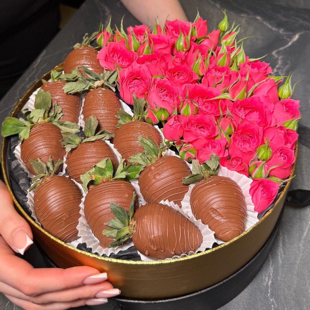 Кустовая роза - 5 шт. Коробка - 1 шт. Клубника в шоколаде - 11 шт.