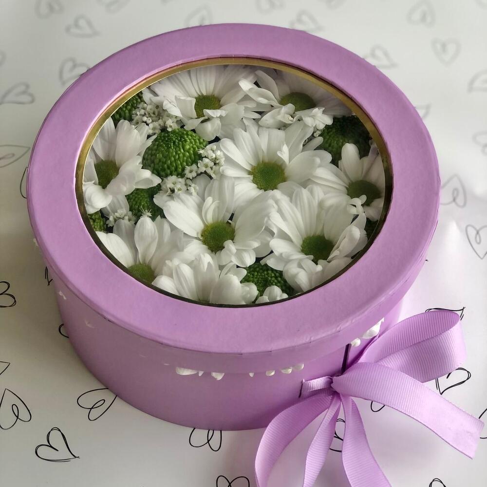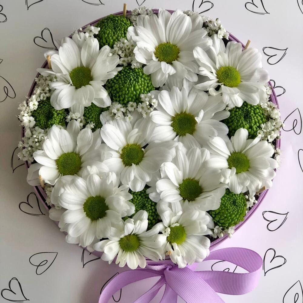 Хризантема кустовая - 2 шт. Конфеты Raffaello - 70 гр. Коробка - 1 шт. Оазис флористический - 1 шт.
