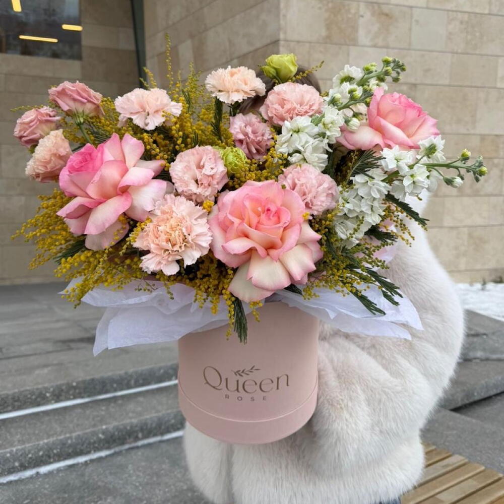 Маттиола - 3 шт. Мимоза - 3 шт. Роза - 3 шт. Эустома - 3 шт. Кустовая гвоздика - 3 шт.