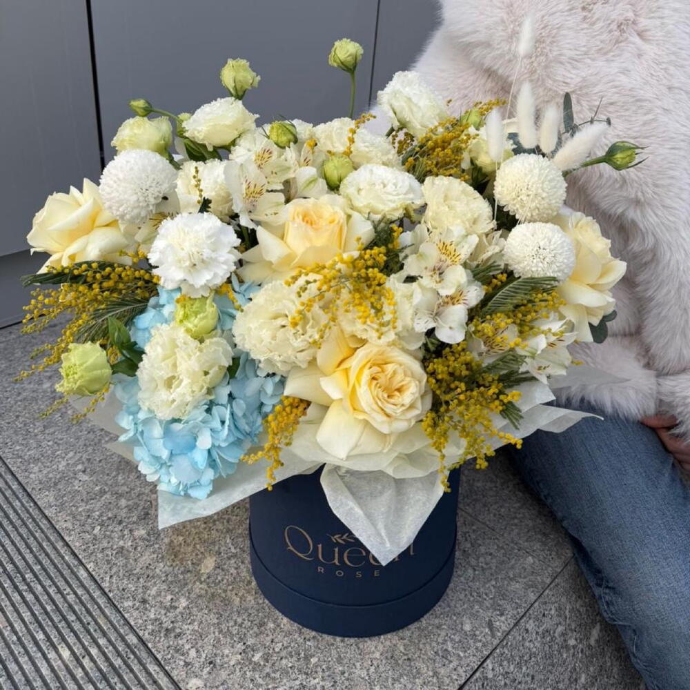 Альстромерия - 2 шт. Гортензия - 1 шт. Мимоза - 3 шт. Гвоздика - 3 шт. Эустома - 5 шт. Хризантема момоко - 3 шт. Сухоцвет лагурус - 5 шт.