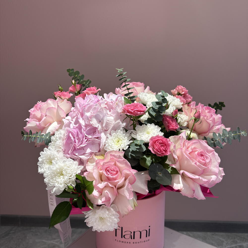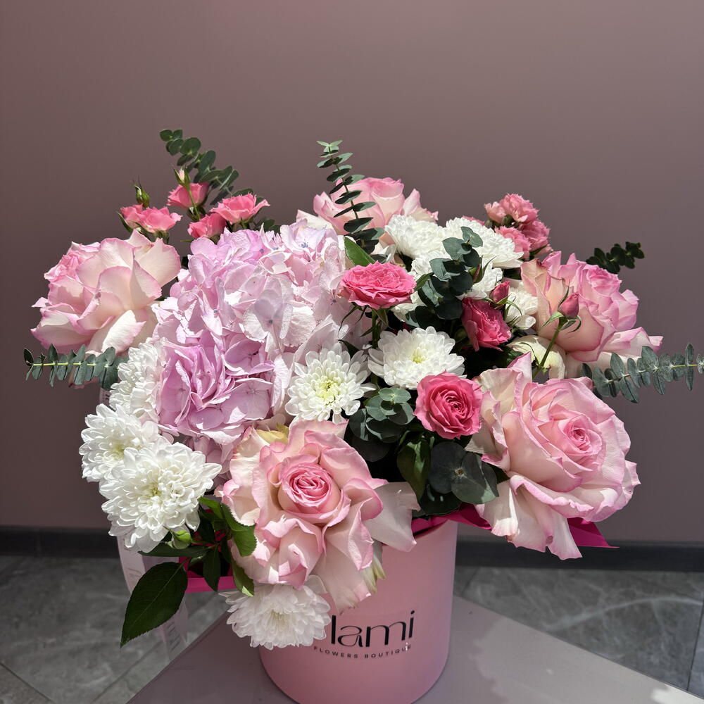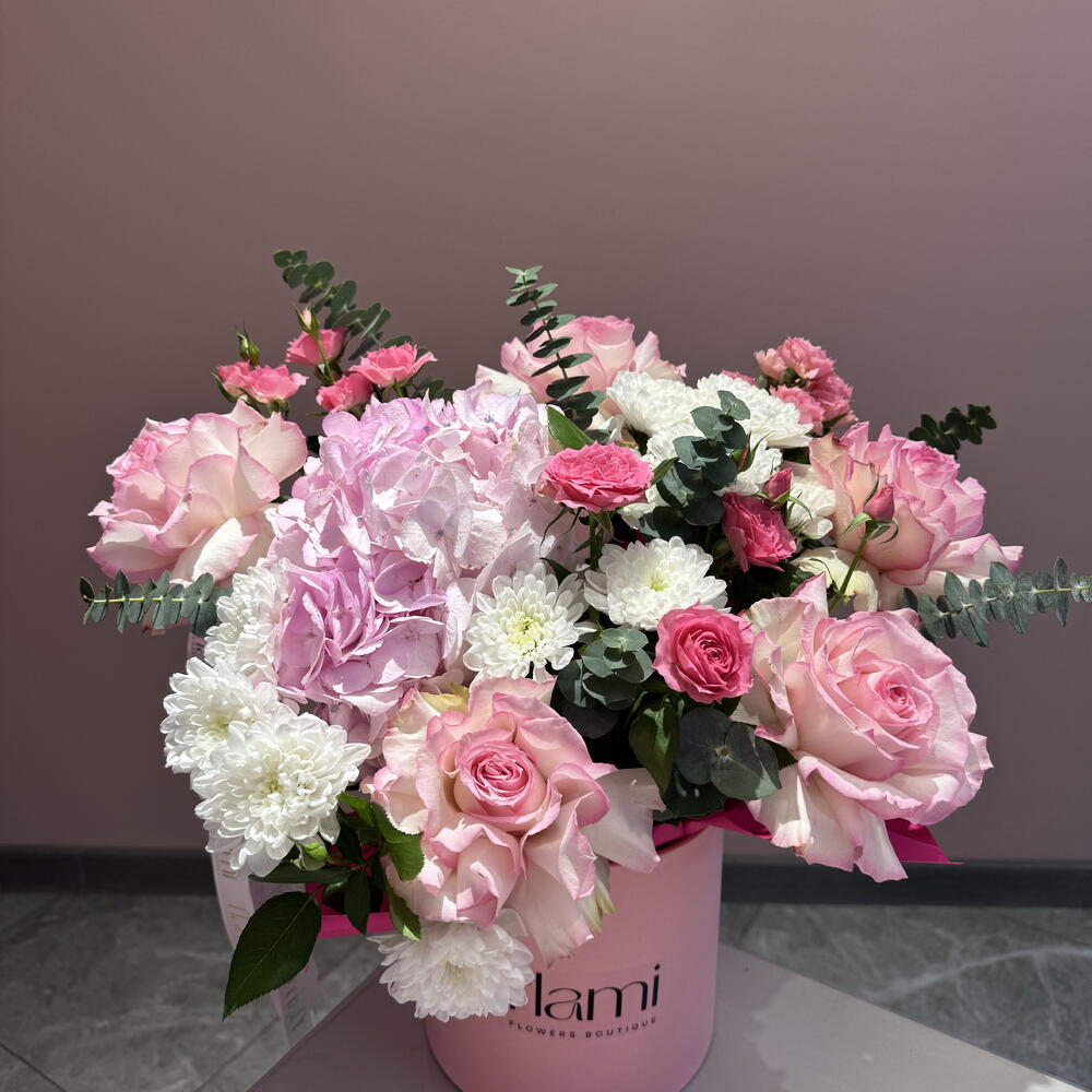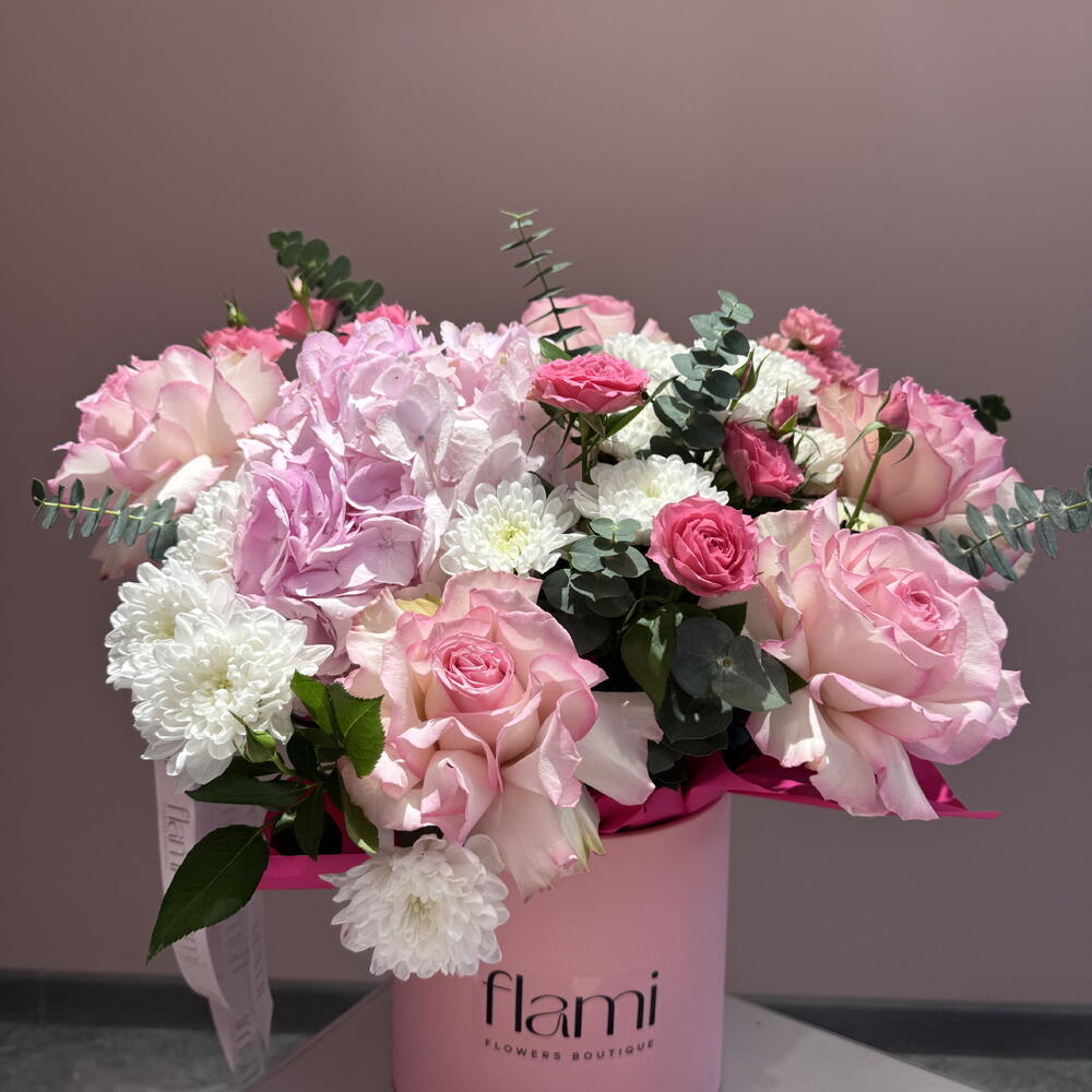 Роза кустовая - 3 шт. Хризантема кустовая - 2 шт. Эвкалипт - 2 шт. Роза - 5 шт. Гортензия розовая - 1 шт.
